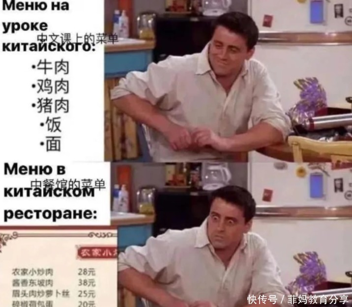 这位外国学生在学习中文的时候,把中国的食物类型了解的差不多了,于是信心满满的走进了餐厅,结果发现,书上的知识一点也用不上,惊得瞪大了眼睛。