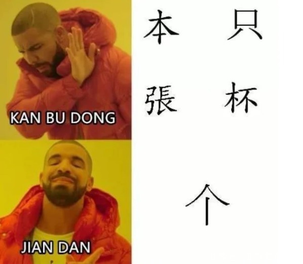 而在外国学生眼中,世界上的量词只有“个”,其实这个中国学生学习语法是一个道理,中国学生也弄不明白过去时、将来时等。